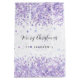 Um fundo branco na moda, decorado com violeta, faux confetti colorido, cintilações. Personalize e adicione seu nome de família. Texto: Feliz Natal.