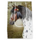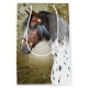 Trabalho de arte original digital de Jayne Wilson mostra um retrato da cabeça de um Pôneo Indiano Appaloosa em uma cabeceira vermelha, com sotaques e penas ouros.