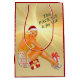 A frente deste saco de presentes de Natal mostra uma imagem impressionante de uma garota loira de 40 anos ou 50 vestida de maiô vermelho e verde e um chapéu de Papai Noel. Ela tem pacotes de presentes brilhantes ao seu redor. As imagens são colocadas sobre um plano de fundo de gradiente dourado, ligeiramente fundido. O texto diz "Este pacote é para você". A parte traseira da tag tem a mesma imagem, mas sem o texto. Os lados e a borda do saco estão a vermelho. Bonito, com um toque de "malandro"!