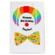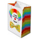 Adicione um toque colorido e personalizado a presentes com este saco-presente personalizado. Ele apresenta uma ilustração de um palhaço vestindo uma peruca colorida no arco-íris, nariz de palhaço vermelho e gravata de arco bolinhas amarela e está pronto para ser personalizado com sua própria mensagem e nome. A bolsa coordena faixas de sotaque arco-íris nos painéis laterais.