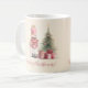 Um biscoito rosa giro fica na véspera de Natal próximo a uma bonito árvore de Natal decorada e um conjunto de presentes cor-de-rosa. A cena é de um design de aquarela vintage. Esperamos que concorde conosco que é tão fofo! "Feliz Natal!" é a saudação. Você pode mudá-lo se quiser. Certifique-se de editar o nome da família e os exemplos de data.