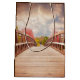 Uma bolsa de presente de aniversário com uma fotografia cênica. Uma ponte de madeira em direção a um caminho rodeado por árvores florestais mudando de cor.