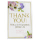 Esta bolsa de presentes é uma maneira maravilhosa de obrigado de convidados especiais, família ou membros da sua festa de noiva. Apresenta um texto dourado e cor-de-rosa sobre fundo branco com uma borda de quadrados offset dourada e um belo buquê pastel de flores, incluindo rosas cor-de-rosa, lírios e orquídeas brancos, e hidrangea púrpura ou lavanda leve. O texto é totalmente personalizável e diz: Obrigado por celebrar conosco, e tem os nomes dos casais.
