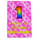 Este design de bolsa de presente, com temas de aniversário otimistas, amorosos e divertidos, apresenta um grande número de "1" com um padrão de estilo de gradação do espectro arco-íris, juntamente com a mensagem "primeiro aniversario Feliz", e um nome de destinatário personalizado. Também tem um fundo alegre com formas cardíacas cor-de-rosa dentro de um padrão listrado. Um saco de presentes feliz como este pode ser usado ao embrulhar presentes que estão sendo dados a alguém em comemoração de seu primeiro aniversario. [~Z0000511]