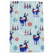 Um saco de presentes de férias com um padrão repetitivo. Ilustrado com um par de veados escandinavos vestindo lenços vermelhos. Com marcas decorativas em seus corpos. Além de um trio de árvores de natal vermelhas e azuis com uma estrela no topo. Flocos de neve rico espalhados.