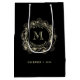 Eleve os presentes da sua festa de casamento com este saco de presente para padrinho em preto e dourado. Com uma inicial personalizada, moldura floral intrincada e a data do seu casamento, é uma maneira luxuosa de agradecer aos seus melhores companheiros com elegância e coordenação.