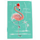 Na moda design com um toque retrógrado com flamingos cor-de-rosa festivos vestindo chapéus de Papai Noel, estrelas e palmeiras decoradas com bolhas contra fundo aqua. Um design personalizável para você personalizar com seu próprio texto, imagens e ideias. Uma imagem de arte digital original criada por Quirky Chic.