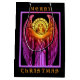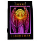 Um dramático anjo de vidro manchado, em cores de joias vibrantes com um halo ouro, anunciando o advento do Natal.