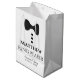 Esta bolsa de presente foi projetada para seu Portador de Anéis. O design apresenta texto preto e uma gravata preta com botões em fundo branco. Inclui um espaço para o seu nome, bem como o nome do casal e a data do casamento. Preencham-se com presentes, favores, doces, bebidas, ou qualquer outro tipo de bagunça de casamento. Excelente maneira de o obrigado por fazer parte da sua festa de casamento.