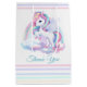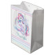 Saco de Presente Médio para uma festa de aniversário mágica com um adorável unicórnio com asas nas nuvens sobre fundo arco-íris.