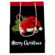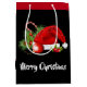 Esta bolsa de presente de Natal é mostrada a preto com uma corda vermelha e uma impressão de arte festiva de chapéu de Papai Noel. Personalize este item ou comprar como está.