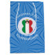 Saco médio de presentes mostra um anjo vestindo a bandeira da Itália para decoração de presentes de Natal ou decoração de Chanucá. O anjo da bandeira italiana encontra-se em dentro de um fractal circular branco de quadrados rabugentos. O fundo é um fractal azul de quadrados rabugentos. Adicione seu próprio texto ou personalize com um nome e o ano. A bandeira é um tricolor vertical de listras vermelhas, brancas e verdes. É frequentemente chamada IL TRICOLORE.