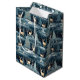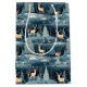 A snowy midnight blue field full of tan deer and robust pine trees.