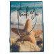 Um saco de presentes com uma foto cênica. Um grande peixe-estrela colocado em pé numa praia arenosa. Um belo mar azul com ondas de surf branco no fundo.