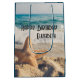 Um saco de presentes com uma foto cênica. Um grande peixe-estrela colocado em pé numa praia arenosa. Um belo mar azul com ondas de surf branco no fundo.