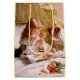 Vintage illustration of a lovely young girl praying before having breakfast in bed while a cute little kitten and a small dog are watching, eager to catch a piece of food. Oil on canvas by Charles Burton Barber.