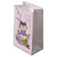 A menina doce senta-se numa pilha de presentes. O plano de fundo é rosa claro com bolinhas cor-de-rosa mais escuras. A cor do texto corresponde aos pontos. Excelente para a neta excelente de um ano, mas pode ser personalizada para relação e idade.