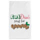 Slogan "Coma, Beba e seja feliz" em sacos de presente de Natal em verde festivo com biscoitos em forma de coração de pão de gengibre e decoração sagrada. Ideal para presentes de comida ou bebida.