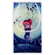 "Mal-iluminada" Uma gótica, parecida com uma boneca, com pigmeus vermelhos ferozes, fica em um topo surreal debaixo de uma lua de cheio brilhante. Vestida em uma roupa escura enfeitiçada com crânios e segurando um coelho estirado, ela está cercada por tentáculos riscados brancos, negros e brancos que torcem através de um céu noturno esboçado por estrelas.