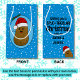 Adorável e engraçado batata marrom feliz vestindo um chapéu de Papai Noel vermelho e branco. A batata está em um estilo de arte cartoon e castanho colorido, tem braços e dedos colados e um sorriso grande e feliz com pontos para os olhos. O chapéu de Papai Noel em sua cabeça é vermelho, com um verme branco e uma pompom branca pendurados. Ele tem dentro a forma oval azul claro com uma estrutura azul escura e duas folhas ocas verdes com duas bagas vermelhas no topo do oval. A cor de fundo é um azul claro, com flocos de neve brancos flutuando prestes a dar uma sensação festiva a essas sacolas de presentes sazonais bonitinhas. Na parte de trás da bolsa estão modelos de texto para deixar como estão ou substituir o texto por sua própria mensagem E adicionar seus nomes.