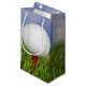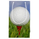 Bola de golfe branca sobre a teta vermelha na grama com céu azul.