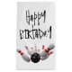 Pinos de boliche e bola em fundo branco de textura macia para o aniversário. O plano de fundo pode ser alterado. O texto é editável.