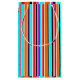 Este saco-presente tem um design simples de faixas verticais de espessuras variáveis em vermelho, laranja, roxo, preto, azul claro e branco.
