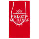 Esta bolsa de presente de Natal é mostrada com um impressão festivo Flocos de Neve Feliz de Natal. A cor do pano é Vermelho Personalize este item ou comprar como está.