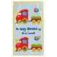 Feliz aniversario para alguma menino ou menina que gostar de trens. Caracteriza um trem colorido bonito do brinquedo dos desenhos animados. Tem um vermelho e o motor amarelo, as rodas amarelas, e estão puxando pilhas em verde, em alaranjado, o roxo e o vermelho. Os balões estão voando do back-end. Tudo em um fundo da luz - ou na mudança azul e amarela a toda a cor, seja certo fazer ambos os lados. Apenas adicione o nome do aniversário ou suas palavras. O estilo e a cor do texto podem ser mudados e feito sob medida para caber se necessários. As repetições do design na parte traseira, certificam-se que as mudanças estão feitas em ambos os lados. Projete ajustados os tamanhos pequenos e médios do produto somente. Divertimento e colorido para algum aniversário, ocasião, ou partido.
