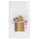 Um gato de mesa laranja a espreitar de uma caixa de presente listrada no arco-íris completa com um arco de ouro, confete, galhos e pronto para festas. Celebrar aniversários, feriados ou ocasiões especiais. Arte de Margaret Loftin Whiting.