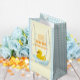 Um pato sortudo! Primeiro aniversário com pato de borracha e bolhas contra gingham azul claro e fundo amarelo pálido com texto laranja