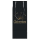 Sacos-presentes de vinho com uma ilustração dourada sobre fundo de cinza negra. Projetado com uma ilustração de uma montanha com raios solares brilhando por trás. A tipografia diz: "A vida é uma descoberta de sonho de uma Aventura".
