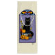 Um gato preto sentado sobre uma pilha de livros com uma vela vermelha, abóboras, suspensórios de olhos pretos e uma borboleta de vidro manchado num pano de fundo de roxo e amarelo-claro.