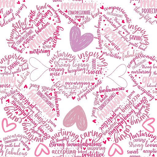 Mãe dias corta 01.Palavras cor-de-rosa e padrão de símbolos em forma de coração para o Dia da Mãe Esta imagem é uma bela e intrincada nuvem de palavras celebrando mães e avós. As palavras estão dispostas em forma de coração, com as palavras "Mamãe", "vovó" e "mamã" destacadas. Outras palavras incluem "compassivo", "inspirador", "educador", "carinho", "carinho", "pensativo" e "protetor". A imagem é cheia de corações e espirais cor-de-rosa, criando um senso de calor e amor. O efeito geral é de celebração e apreço pelas mulheres especiais em nossas vidas.
