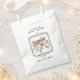 Sacolas de Favor para Chá da Tarde apresentam uma tipografia caprichosa moderna de "Chá da Tarde". Este design inclui elementos de azul, amarelo e rosa, um fundo de azulejos, espirais e bordas inspiradas no design vitoriano. Inclui modelo para personalização.
