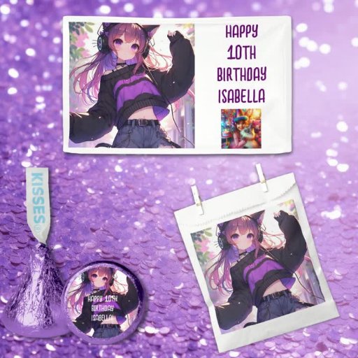 As bolsas de aniversário da garota. Menina de anime bonita vestindo fones de ouvido com orelhas de gato e um suéter roxo e preto. Festa de aniversário bonita para garotas de jogos ou amantes de música ou aqueles que amam o tema da pelagem. Apenas adicione o nome da aniversariante na área de personalização.