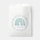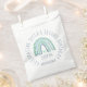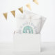 Comemore seu aniversário com esta ilustração fofa do arco-íris com um coração bonito em tons verde-menta e azul com um nome personalizável.