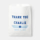 Personalize esta bolsa de favores de festas de papel com um nome e data para a festa de aniversário do seu filho com um tema piloto de caça ou como um favor para uma celebração patriótica. Texto serif azul-claro e azul-marinho e um gráfico de listras e uma estrela se somam ao patriótico, o vírus dos EUA.