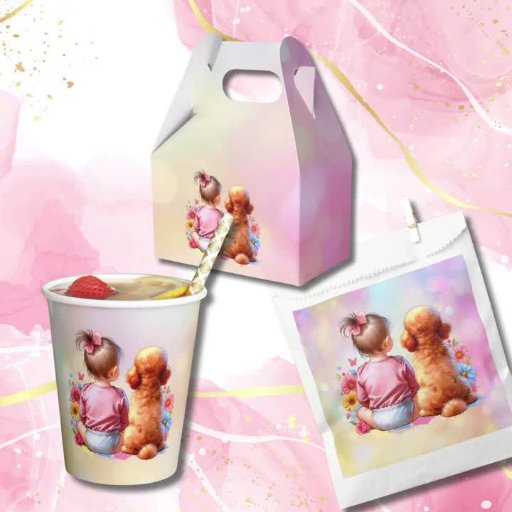 Chá de fraldas a favor das bolsas. Bonito arte aquarela mostrando uma menina com um arco rosa sentado ao lado de seu Poodle Apricot cercado por flores. É uma garota! Rosa e roxo.