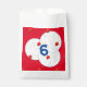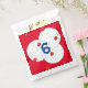 Design apresenta imagens padronizadas de balões e confetti contra três formas brancas circulares. A idade da criança é ilustrada em azul brilhante no centro da design. O fundo é vermelho.