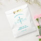 Esta bolsa de favores do Batismo, ou Christening, do partido apresenta uma cruz azul e verde com cor d'água, bem como áreas para personalizar com o nome do seu filho, a data do Batismo, e uma mensagem pessoal especial para seus convidados. Os convites de coordenação também estão disponíveis na coleção "Watercolor Cross" da Grandview Graphics.
