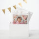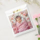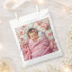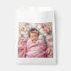 Um doce saco de favores de chá de fraldas para coisas com guloseimas de obrigado por vir com uma menina embrulhada em cobertores brancos e cor-de-rosa macios, abraçando seu gatinho e rodeada por flores rosa.