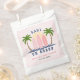 Bebê no conselho surfando salpúsculo cor-de-rosa, bebê chá tag favorito. Prepare-se para abraçar uma adorável onda de doçura! Este tema charmoso de chás de fraldas, recheado de altruísmo, comemora a chegada de um pequeno surfista. Três pranchas cor-de-rosa, palmeiras, e sol se quebrando através de um céu cor-de-rosa macio formando um cenário de praia animado. O salto lúdico de água traz uma sugestão de brincadeira, fazer-a uma escolha ideal para saudar um novo explorador no mundo.