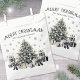 At the bottom of the design is the detailed artwork—a black and white Christmas tree with a soft green tint, surrounded by wrapped presents and delicate falling snowflakes. The clean watercolor style and minimalist layout make this favor bag a stylish and timeless way to package holiday treats, small gifts, or party favors.