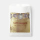 Esta bolsa de lembrança personalizável apresenta um fundo dourado cintilante e opulento, salpicado com purpurina falsa, reminiscente do brilho do champanhe. No topo, cinco bolas listradas elegantes em prata e burgundy pendem graciosamente. A mensagem "FELIZ NATAL" é exibida de forma proeminente em um script festivo vermelho-carássola, com espaço abaixo para personalização. Este design luxuoso captura o brilho elegante de um baile de inverno, tornando-o perfeito para lembranças de festa de fim de ano ou presentes de Natal.