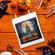 Festa de Halloween favorece bolsas com uma casa assombrada em uma colina com abóboras brilhantes assustadoras no primeiro plano. A atmosfera assustadora criada pela noite escura com lua, árvores assustadoras, casa e as abóboras brilhantes é a maneira perfeita de dar o tom para uma festa de Halloween. Esta ilustração de Halloween é feita em ai art watercolor e lápis.
