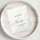 Bolsas elegantes para seus convidados de casamento com "Love + Obrigados" em uma simples tipografia moderna e um roteiro de na moda com pestanas, seus primeiros nomes se uniram por um coração e sua data de casamento.