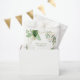 Um belo design de verde rústico com floral branco e uma elegante armação de ouro. Um saco de favores botânicos moderno com flores brancas, folhas verdes e sotaques dourados, ideal para qualquer casamento temático. Os convites de casamento e outros artigos de papelaria também estão disponíveis.