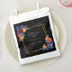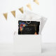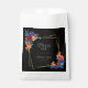 Adoramos cores brilhantes e designs ousadas, então queríamos algo divertido e caprichoso, mas ainda elegante o suficiente para um casamento. Esta bolsa de favores do casamento tem uma abundância de flores coloridas e tipografia moderna em um fundo preto para um sofisticado olhar floral - que ajustado num casamento de todo o ano.