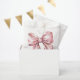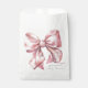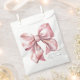 Um design charmoso de bolsa de lembrancinha de festa com um grande laço rosa em aquarela no centro da frente. O nome da futura mamãe é exibido em uma fonte serifada clássica na parte inferior, com "Baby Shower" escrito elegantemente abaixo em caligrafia manuscrita.